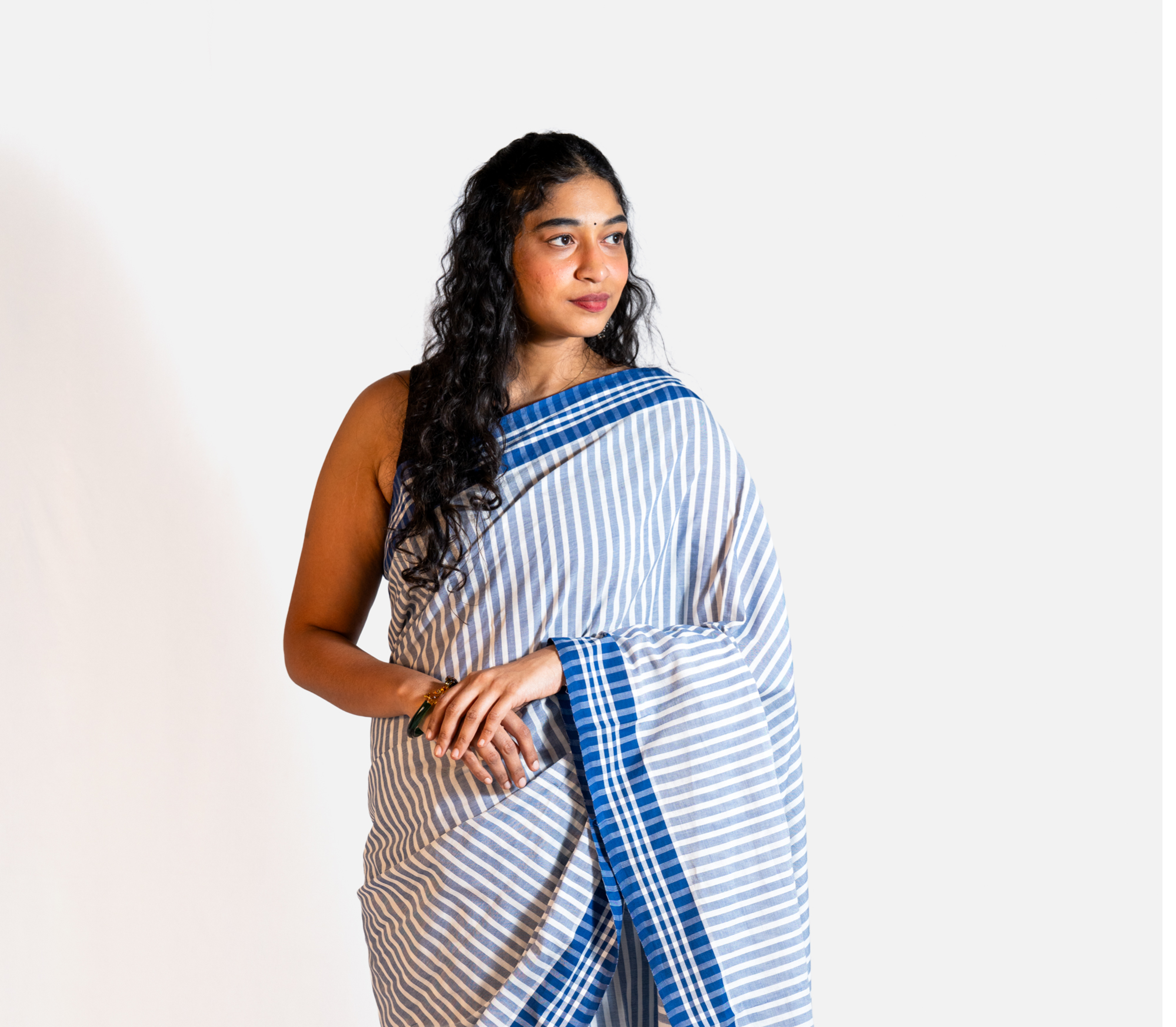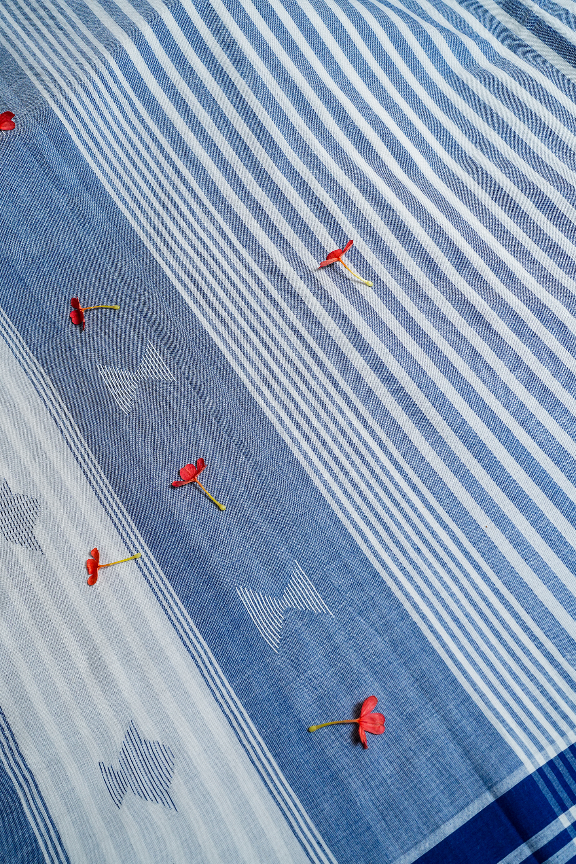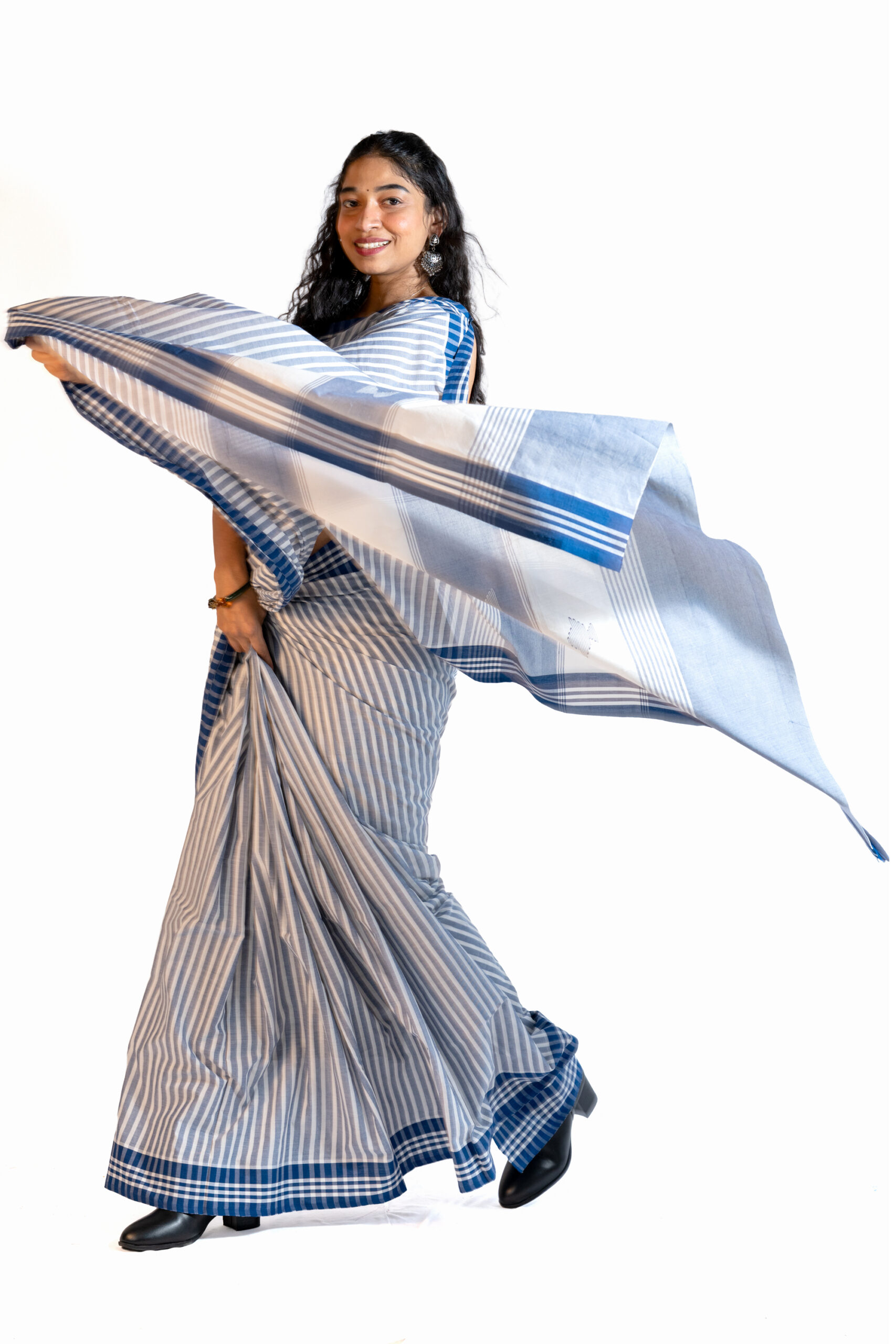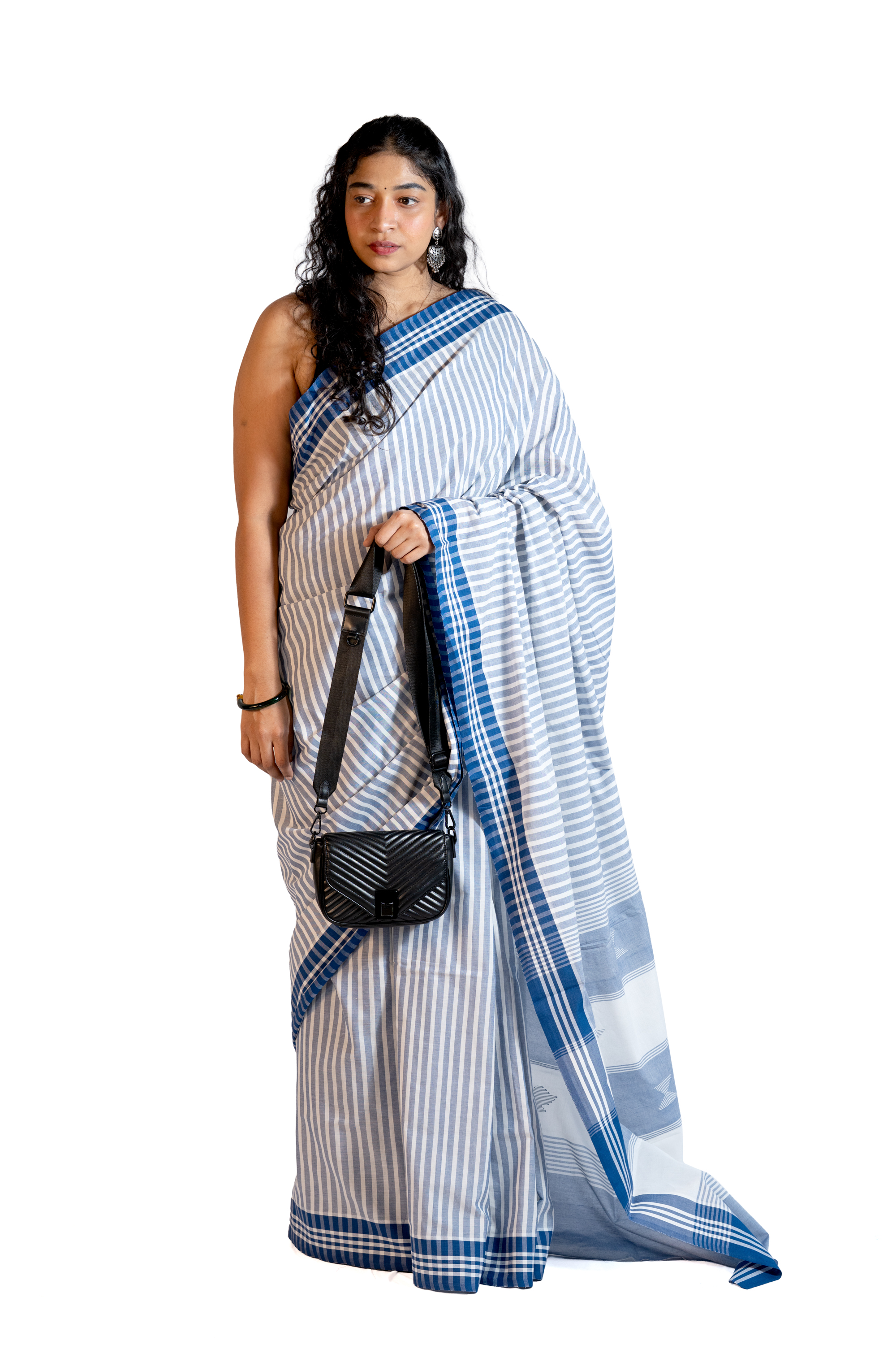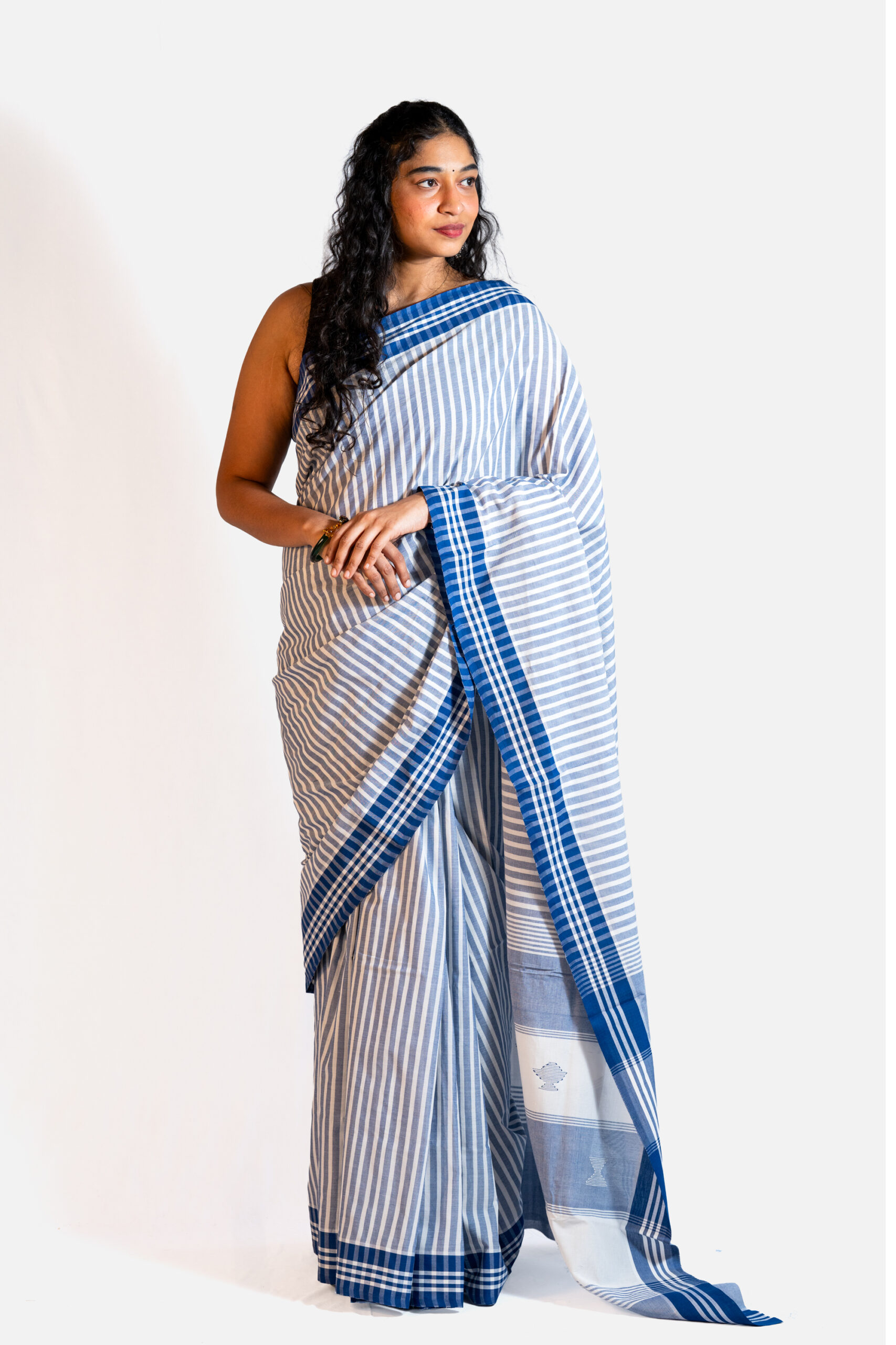 Latest BLUE STRIPED HANDLOOM Saree featuring refined handloom stripes and a deep dark blue border. This saree beautifully blends traditional weaving artistry with contemporary elegance, making it perfect for both everyday wear and special occasions. Its lightweight drape and classic design highlight the charm of handloom craftsmanship, offering a versatile piece for your wardrobe.