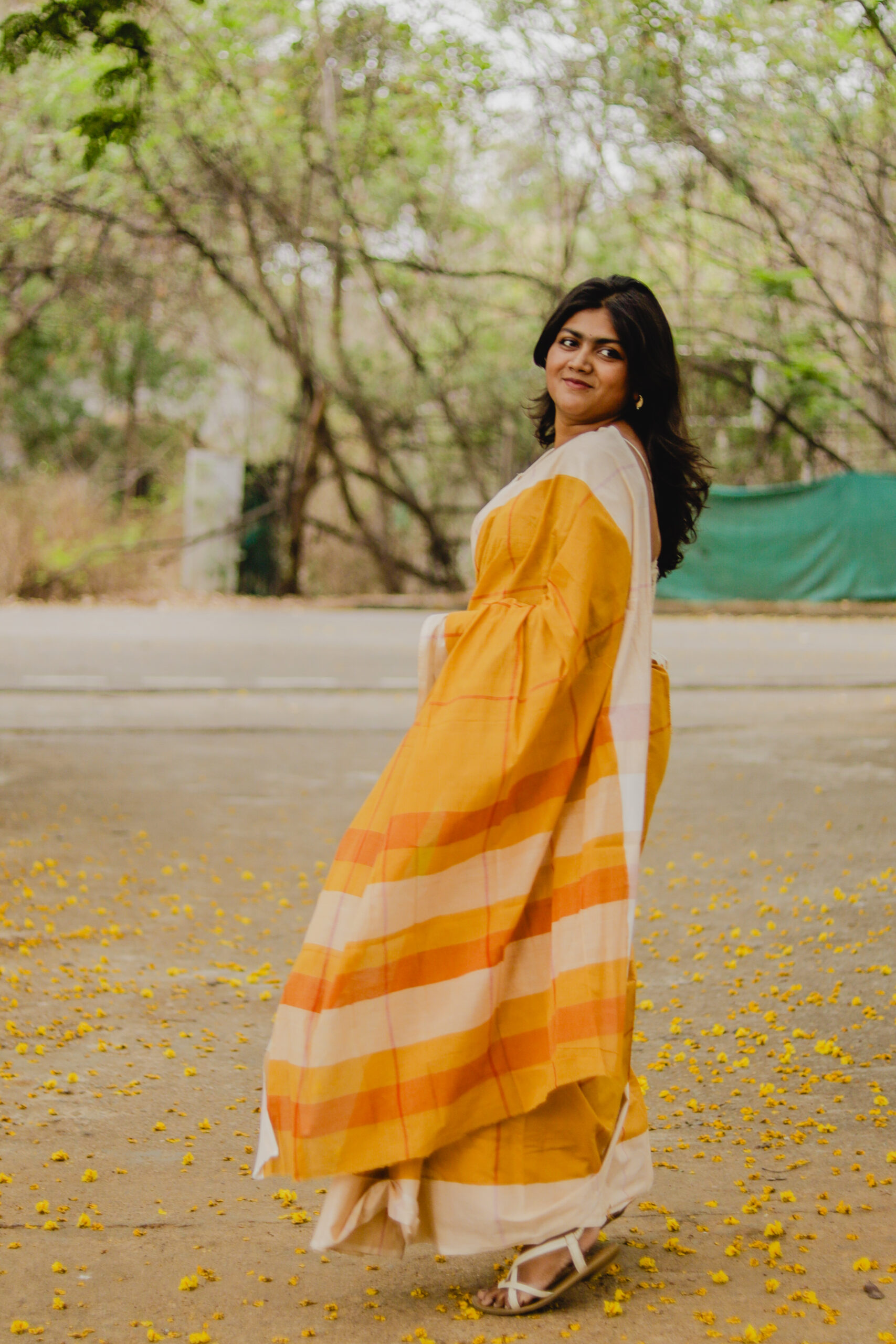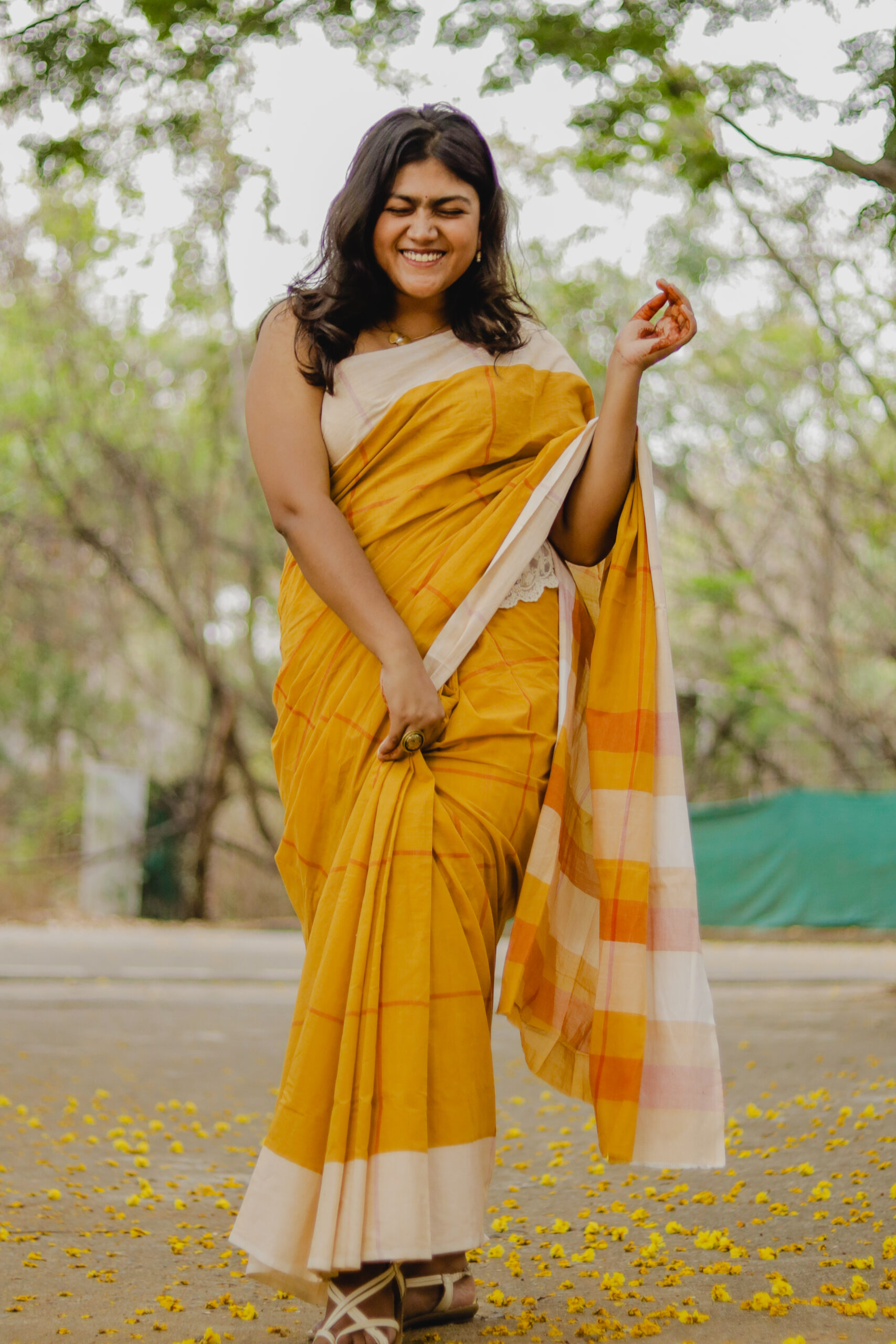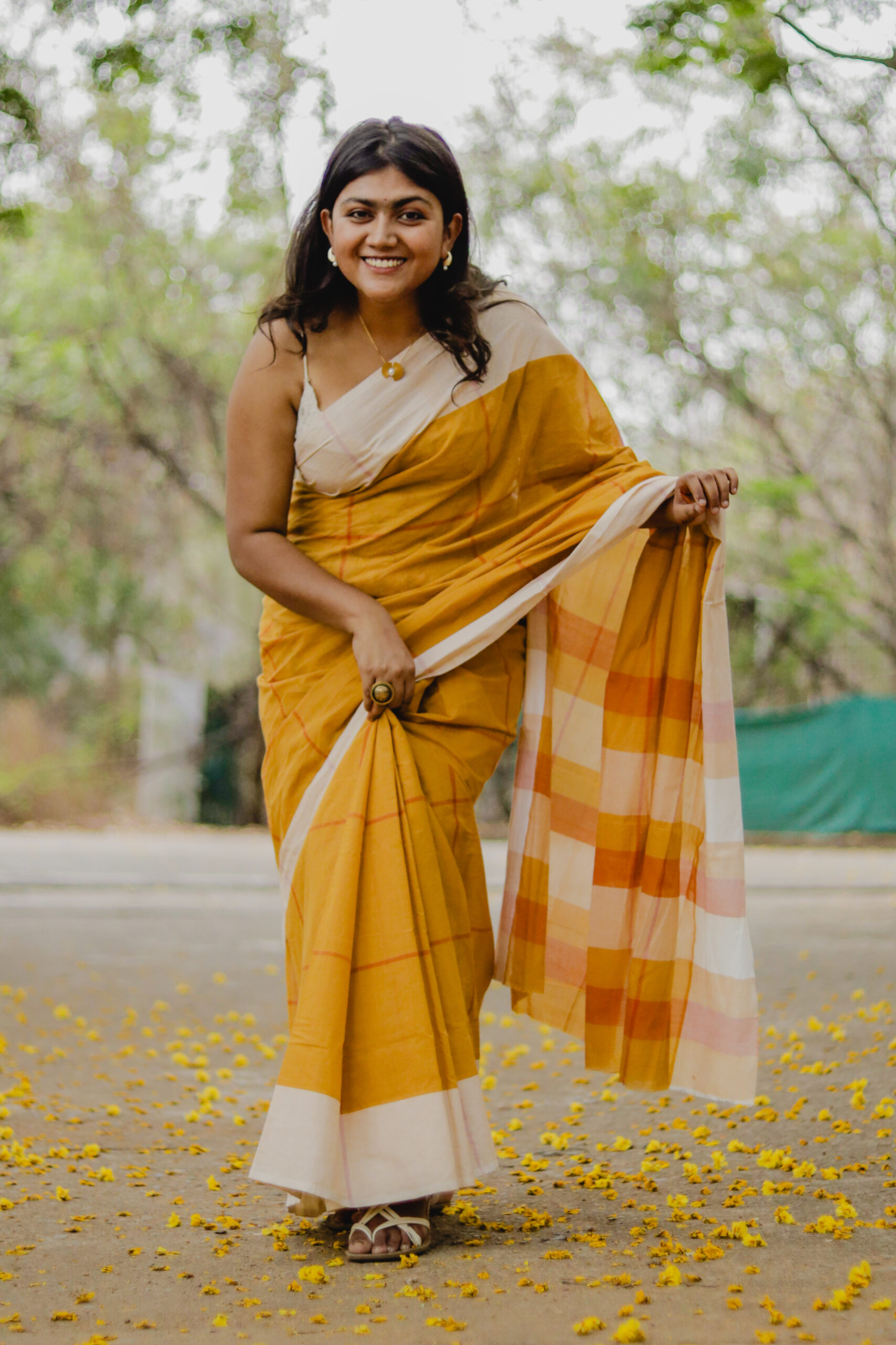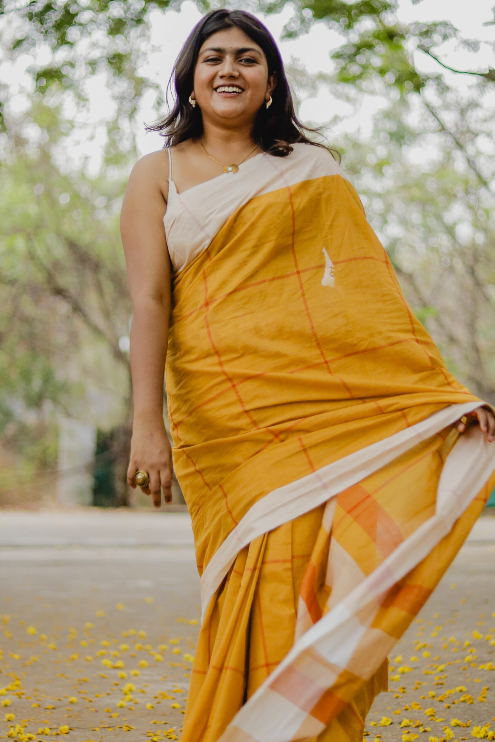 A light, breathable handwoven saree in sun-washed ivory with cheerful marigold checks. Effortless drape, everyday elegance, and rooted in sustainable craftsmanship.