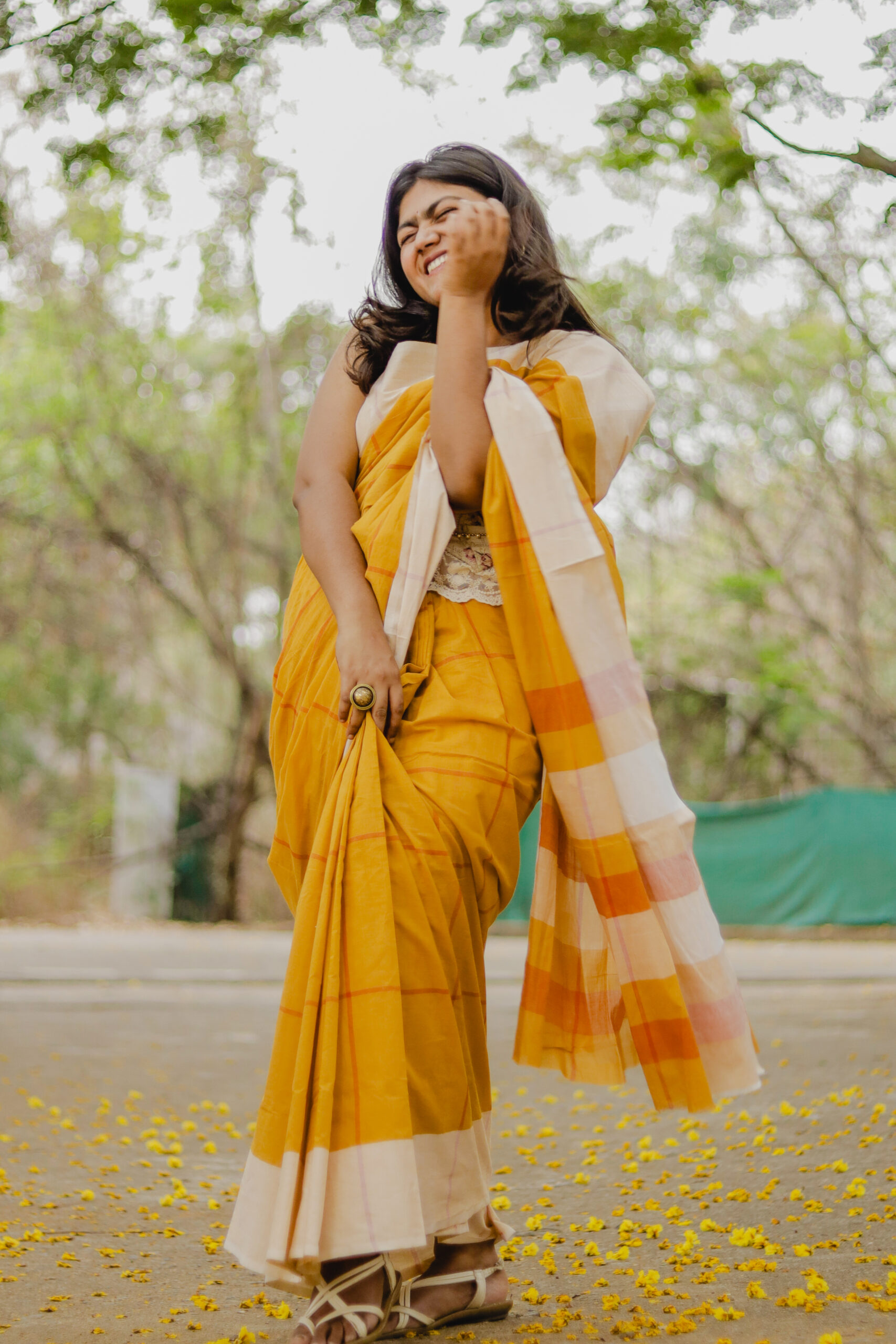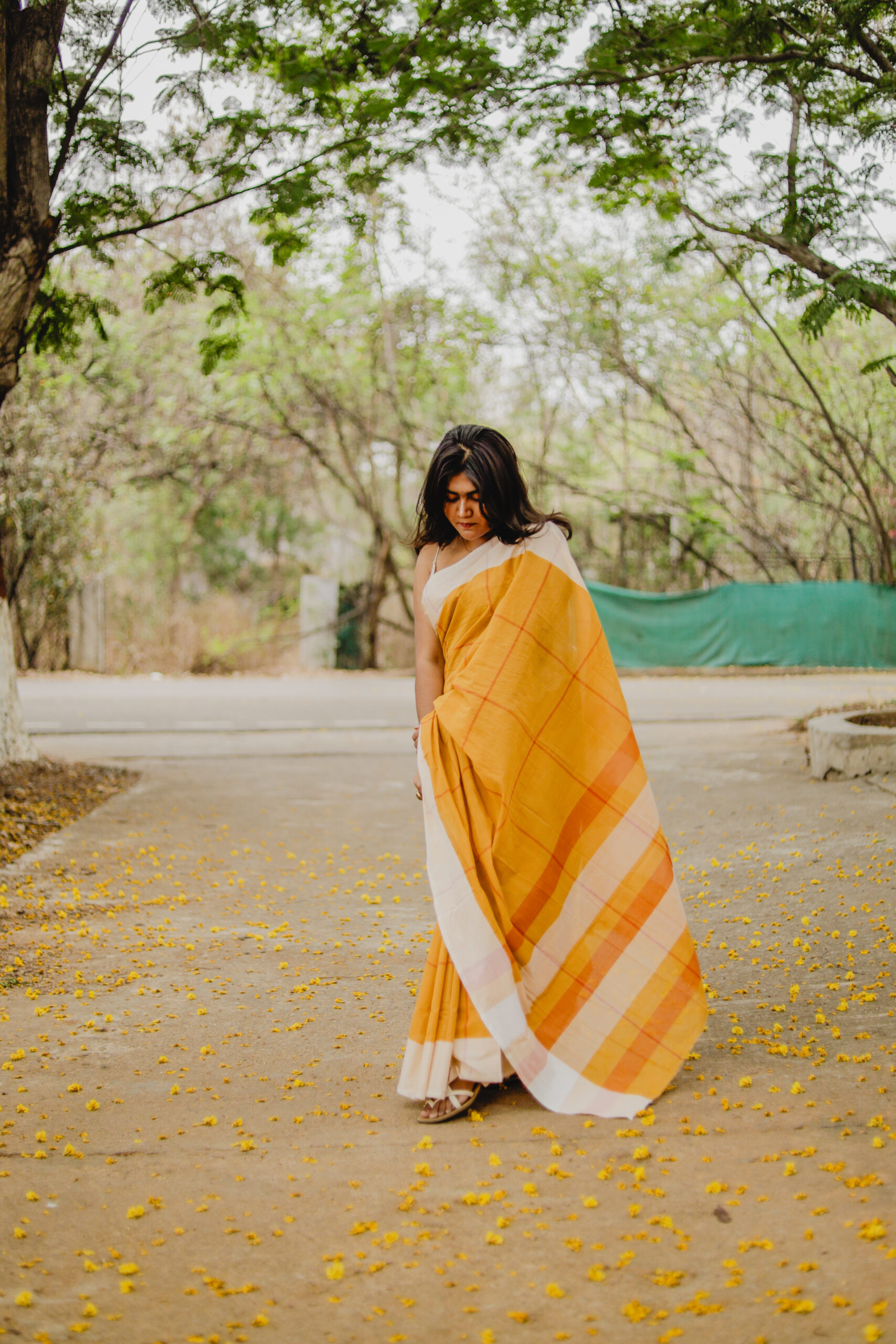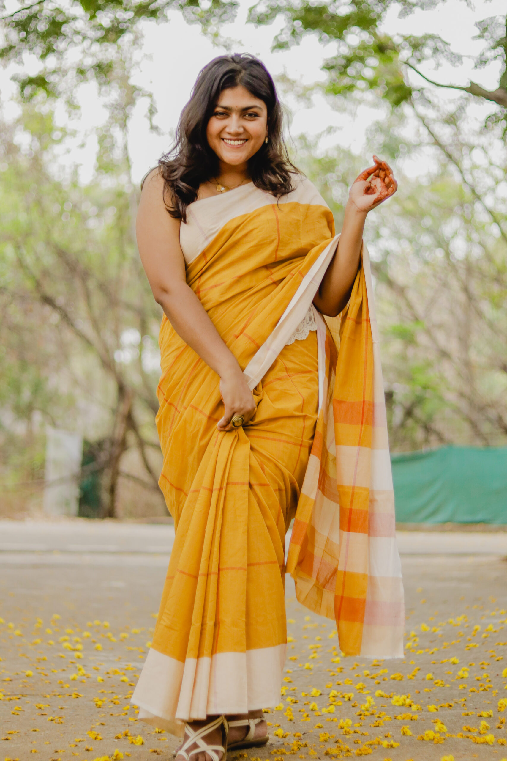 A light, breathable handwoven saree in sun-washed ivory with cheerful marigold checks. Effortless drape, everyday elegance, and rooted in sustainable craftsmanship.