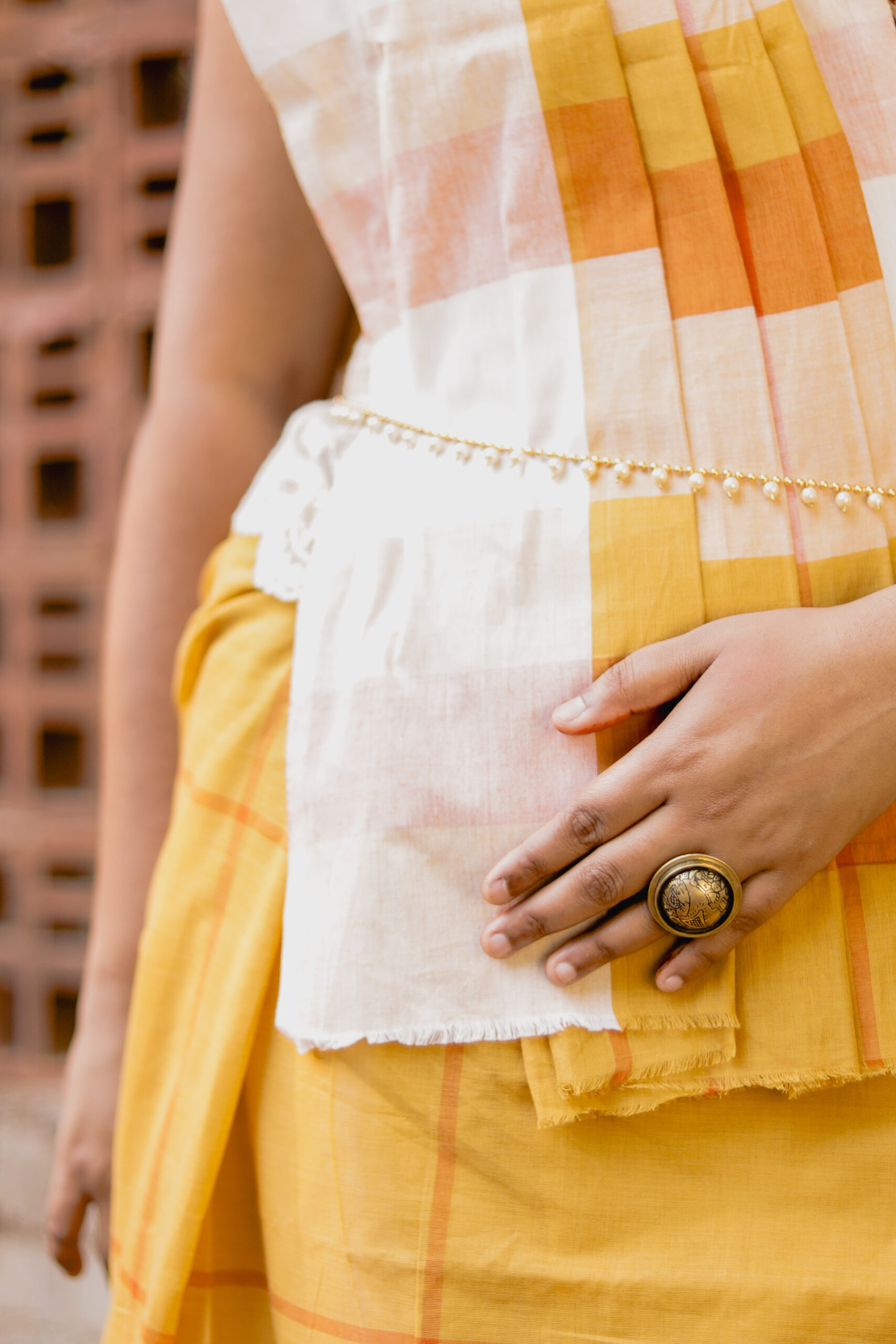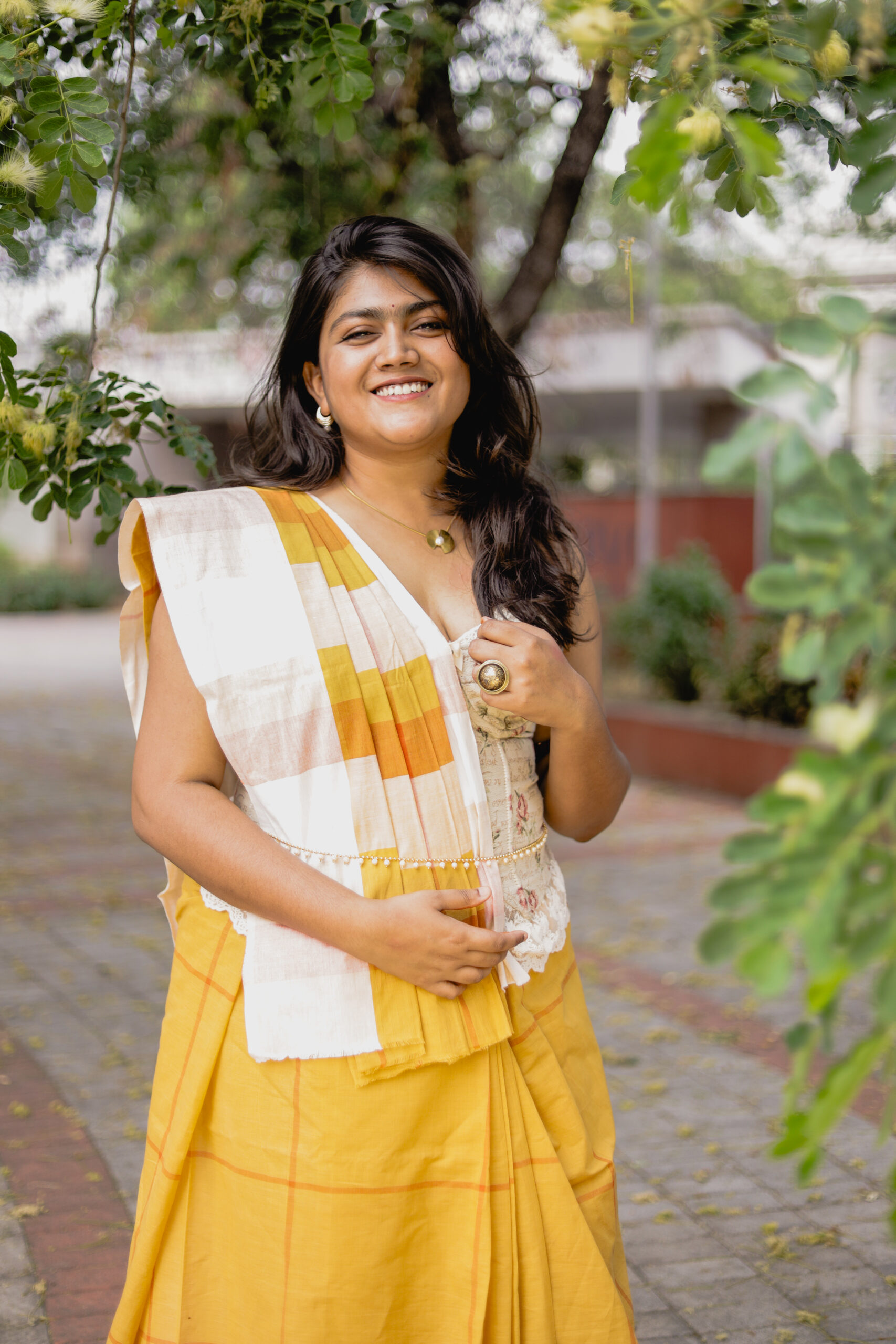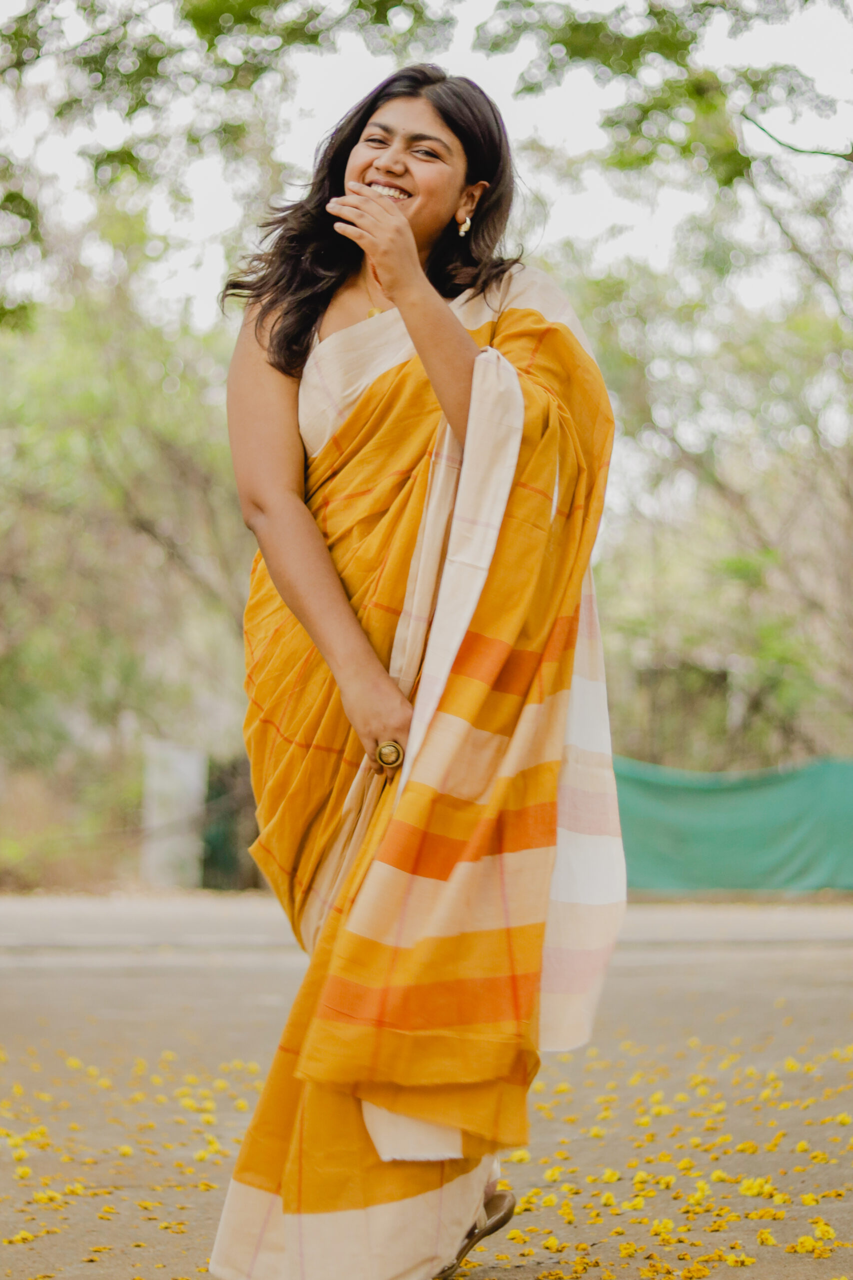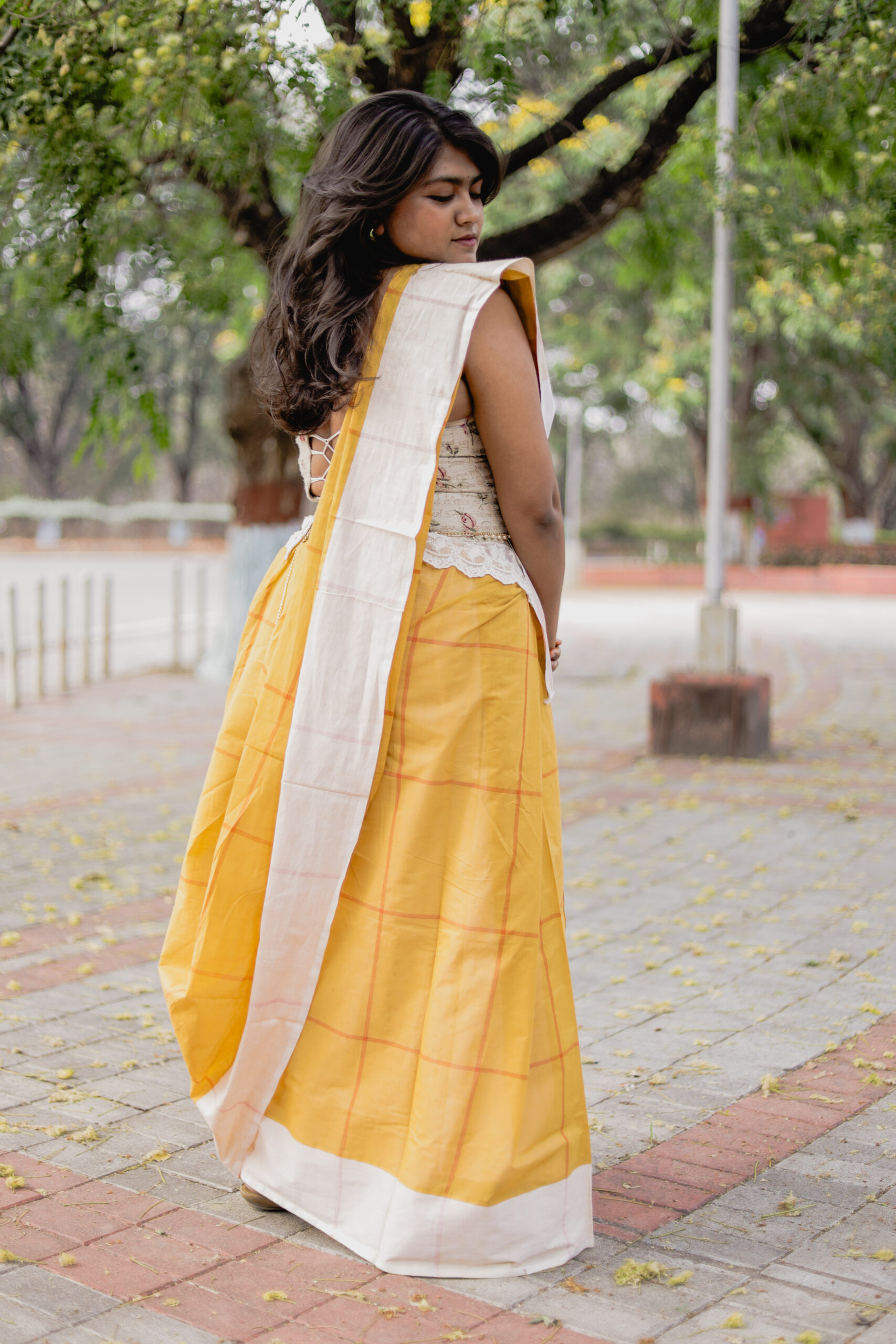 A light, breathable handwoven saree in sun-washed ivory with cheerful marigold checks. Effortless drape, everyday elegance, and rooted in sustainable craftsmanship.